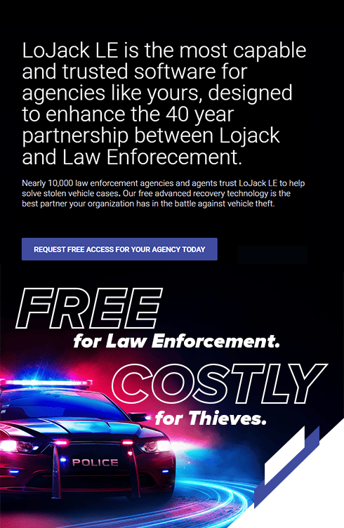 Nearly 10,000 law enforcement agencies and agents trust LoJack LE to help solve stolen vehicle cases. Our free advanced recovery technology is the best partner your organization has in the battle against vehicle theft.